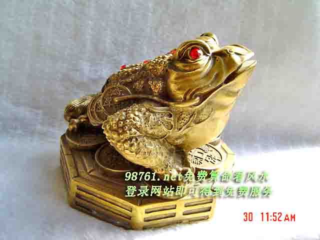 一般蟾的都是四只脚,而旺财的蟾却是三只脚,这是为什么呢?又为什么能旺财呢?这里还有个故事呢。相传在古时后有一名仙人叫刘海,降妖除怪为民除害,他收服了很多妖精,其中一个心肠不是太坏的妖精,被刘海打回原形,原来是一只三只脚的蟾,这只蟾蜍在后来的日子,跟随刘海,伏妖助人,而刘海喜爱布施金钱给一些贫苦人,所以三只脚的蟾蜍亦有使人钱财转富的能力,所以后人在屋里摆放三只脚的蟾蜍,把蟾蜍作为旺财的神兽,择其时日,选准方位,其效果灵验无必。 居说金蟾还有一个习性,非财地不居,象凤凰非梧桐不落,三只脚的蟾所居之地,都是聚财之宝地,因此家庭内摆放金蟾,有吸财,吐财,聚财的作用,是经商最好也最能旺财运的最好吉祥物。 蟾蜍的制品,以玉器和铜制品最为常见,其次也有瓷制品。玉器和瓷制品的适合摆放在五行属木土的方位,铜制品的蟾蜍适合摆放在五行属金水的方及火的方位,如果摆放得时得位,其一两个月即能见效。